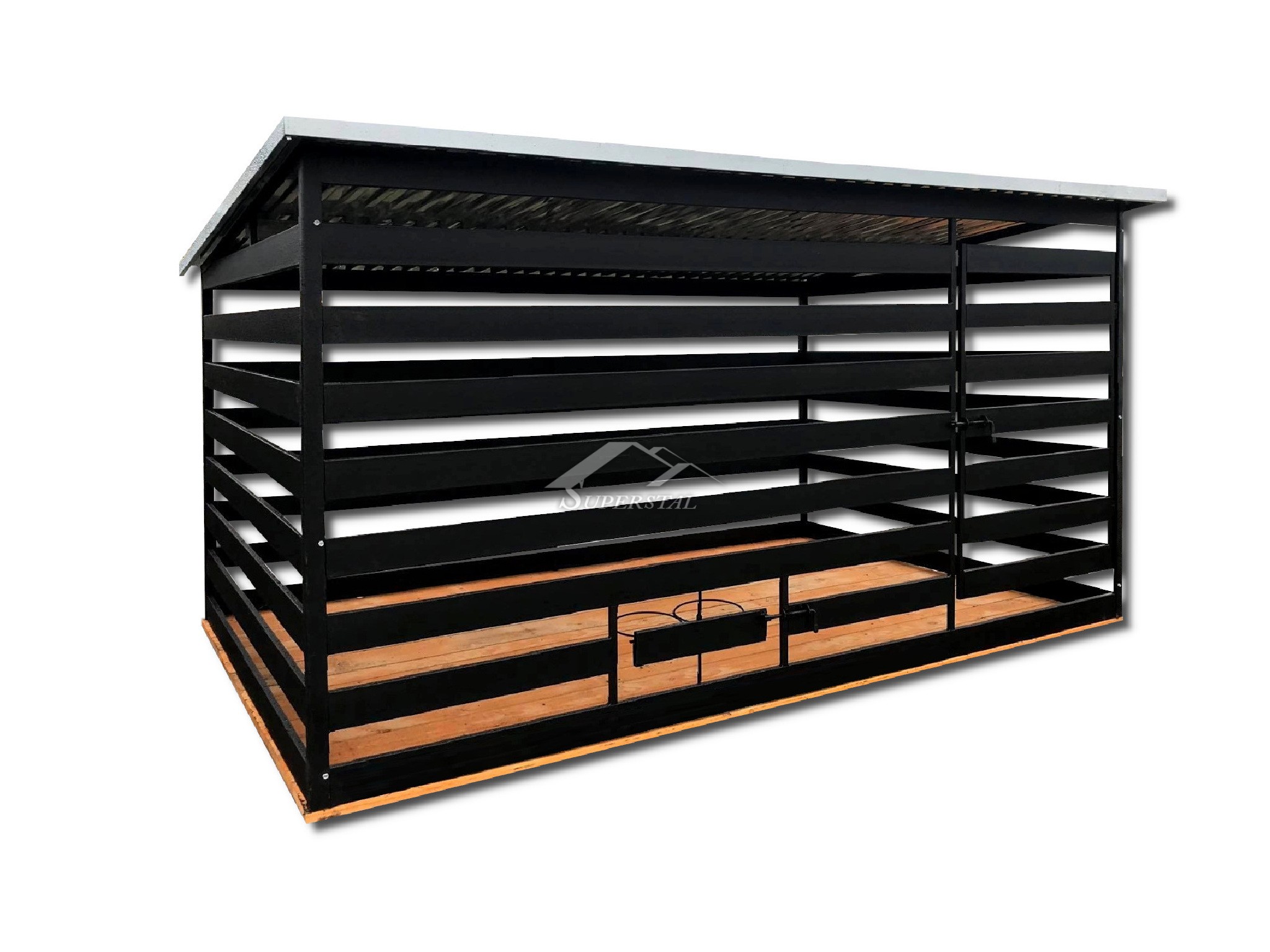 Voljeras pagamintas iš horizontalių uždarų profilių 100mm x 20mm, dažytų juodais dažais ,tarpai tarp profilių apie 9cm